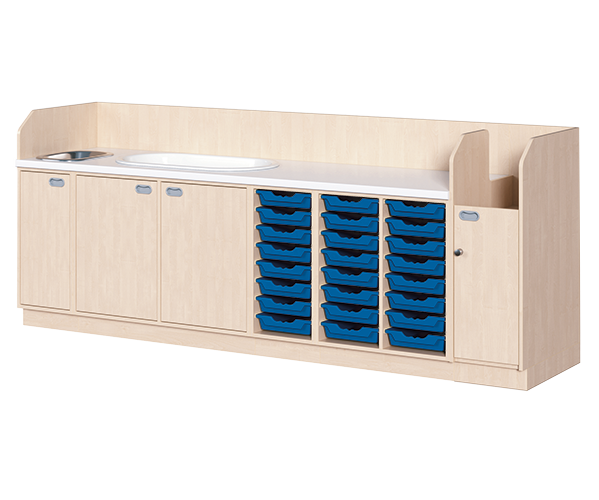 Ob als einzeln aufgestellter Wickelschrank oder als große Wickelkombination - in jedem Fall bieten die verschiedenen Elemente der Wickelkommoden langlebige Materialien, geprüfte Sicherheit, ergonomische Maße und zudem viel Stauraum. Dreiseitige Sicherheits-Aufkantungen umranden die Arbeitsplatte, die vorn benutzerfreundlich gerundet ist und über eine beschichtete und damit wasserabweisende Oberfläche mit zusätzlichen antibakteriellen Eigenschaften verfügt. Eingelassene Griffe und der zurückgesetzte Sockel gestatten ein nahes Herantreten an den Wickelplatz. Als Ausstattungen sind verschiedene Varianten rückenschonender Aufstiegshilfen, Schübe, sowie Kinderbadewannen und Handwaschbecken erhältlich. Optional ist eine besonders wasserfeste Sockelvariante lieferbar. Es kann zwischen zwei verschiedenen Arbeitstiefen und Rechts/Links-Varianten der Schränke gewählt werden. Die Belastbarkeit beträgt bis zu 75 kg. Die Wickelauflage ist separat zu bestellen (Art.Nr. "WIC P..." in der jeweiligen Breite und Tiefe). Ebenso ist bei der Bestellung die gewünschte Ausführung der Einhebel-Mischbatterie - schwenkbare oder herausnehmbare Ausführung - (Art.Nr. "KG 02...") zusätzlich zu vermerken.