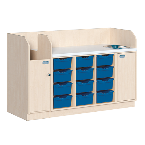 Ob als einzeln aufgestellter Wickelschrank oder als große Wickelkombination - in jedem Fall bieten die verschiedenen Elemente der Wickelkommoden langlebige Materialien, geprüfte Sicherheit, ergonomische Maße und zudem viel Stauraum. Dreiseitige Sicherheits-Aufkantungen umranden die Arbeitsplatte, die vorn benutzerfreundlich gerundet ist und über eine beschichtete und damit wasserabweisende Oberfläche mit zusätzlichen antibakteriellen Eigenschaften verfügt. Eingelassene Griffe und der zurückgesetzte Sockel gestatten ein nahes Herantreten an den Wickelplatz. Als Ausstattungen sind verschiedene Varianten rückenschonender Aufstiegshilfen, Schübe, sowie Kinderbadewannen und Handwaschbecken erhältlich. Optional ist eine besonders wasserfeste Sockelvariante lieferbar. Es kann zwischen zwei verschiedenen Arbeitstiefen und Rechts/Links-Varianten der Schränke gewählt werden. Die Belastbarkeit beträgt bis zu 75 kg. Die Wickelauflage ist separat zu bestellen (Art.Nr. "WIC P..." in der jeweiligen Breite und Tiefe). Ebenso ist bei der Bestellung die gewünschte Ausführung der Einhebel-Mischbatterie - schwenkbare oder herausnehmbare Ausführung - (Art.Nr. "KG 02...") zusätzlich zu vermerken.