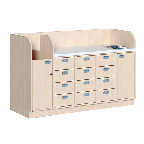 Ob als einzeln aufgestellter Wickelschrank oder als große Wickelkombination - in jedem Fall bieten die verschiedenen Elemente der Wickelkommoden langlebige Materialien, geprüfte Sicherheit, ergonomische Maße und zudem viel Stauraum. Dreiseitige Sicherheits-Aufkantungen umranden die Arbeitsplatte, die vorn benutzerfreundlich gerundet ist und über eine beschichtete und damit wasserabweisende Oberfläche mit zusätzlichen antibakteriellen Eigenschaften verfügt. Eingelassene Griffe und der zurückgesetzte Sockel gestatten ein nahes Herantreten an den Wickelplatz. Als Ausstattungen sind verschiedene Varianten rückenschonender Aufstiegshilfen, Schübe, sowie Kinderbadewannen und Handwaschbecken erhältlich. Optional ist eine besonders wasserfeste Sockelvariante lieferbar. Es kann zwischen zwei verschiedenen Arbeitstiefen und Rechts/Links-Varianten der Schränke gewählt werden. Die Belastbarkeit beträgt bis zu 75 kg. Die Wickelauflage ist separat zu bestellen (Art.Nr. "WIC P..." in der jeweiligen Breite und Tiefe). Ebenso ist bei der Bestellung die gewünschte Ausführung der Einhebel-Mischbatterie - schwenkbare oder herausnehmbare Ausführung - (Art.Nr. "KG 02...") zusätzlich zu vermerken.