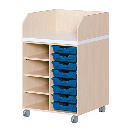 Neben der flexiblen Einsetzbarkeit zeichnen sich die fahrbaren Wickelkommoden zudem durch langlebige Materialien, geprüfte Sicherheit, ergonomische Maße und viel Stauraum aus. Dreiseitige Sicherheits-Aufkantungen umranden die Arbeitsplatte, die vorn benutzerfreundlich gerundet ist und über eine beschichtete und damit wasserabweisende Oberfläche mit zusätzlichen antibakteriellen Eigenschaften verfügt. Eingelassene Griffe und hohe Rollen gestatten ein nahes Herantreten an die Kommode. Als Ausstattungen sind Schübe, Türen und Regale erhältlich. Es kann zwischen verschiedenen Arbeitstiefen und Rechts/Links-Varianten gewählt werden. Die Belastbarkeit beträgt bis zu 75 kg. Die Wickelauflage ist separat zu bestellen (Art.Nr. "WIC P..." in der jeweiligen Breite und Tiefe).