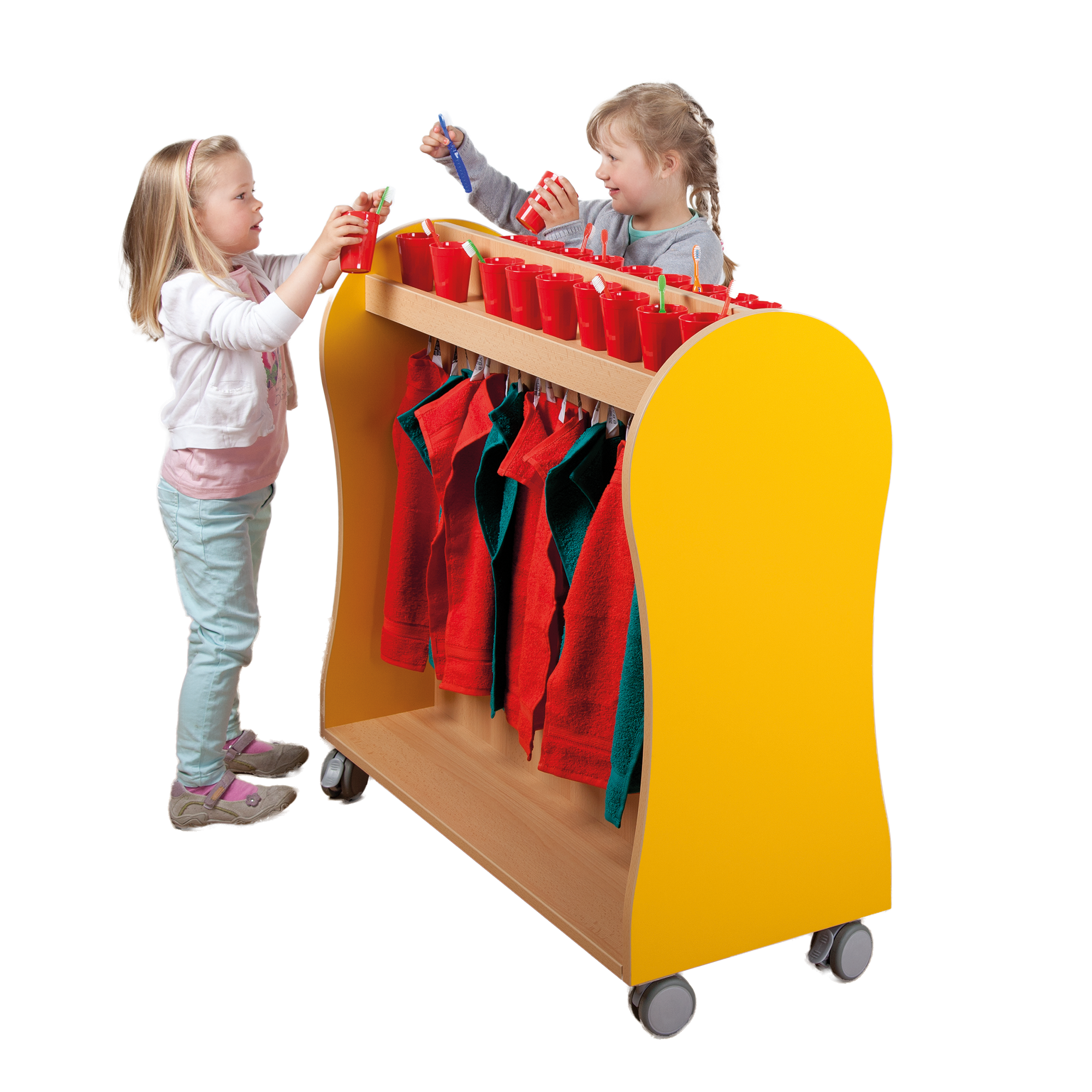 Der kombinierte Handtuch- und Zahnputzwagen ist ein sehr praktisches Möbel, wenn bei räumlicher Begrenzung für eine größere Anzahl von Kindern flexibel agiert werden soll. Der Zugang ist beidseitig möglich und jedes Kind findet über das Erkennungsbildchen an seinem Platz den...