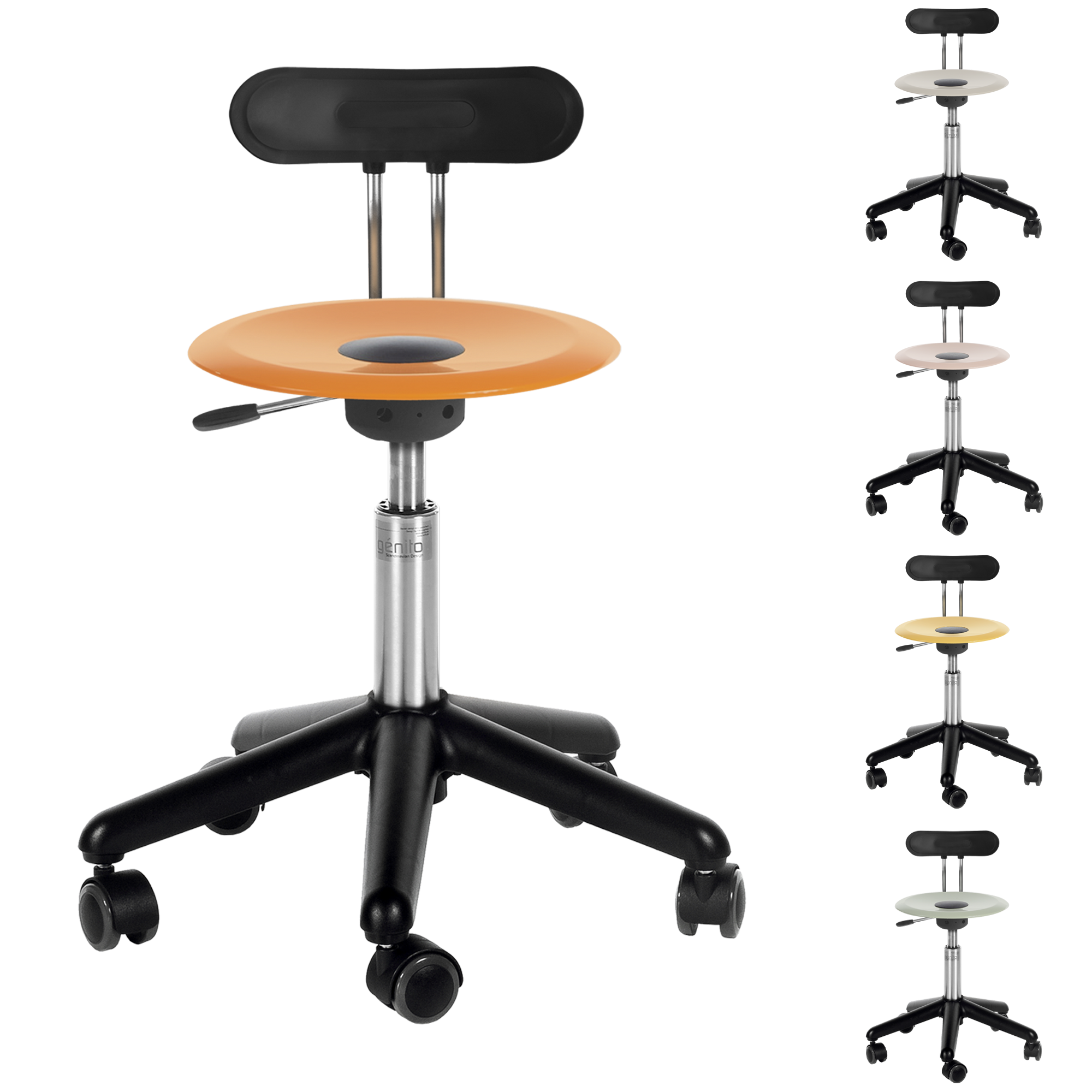 Lieferbare Sitzhöhen: 30-38 cm oder 38-48 cm, mit Rollen oder Gleitern