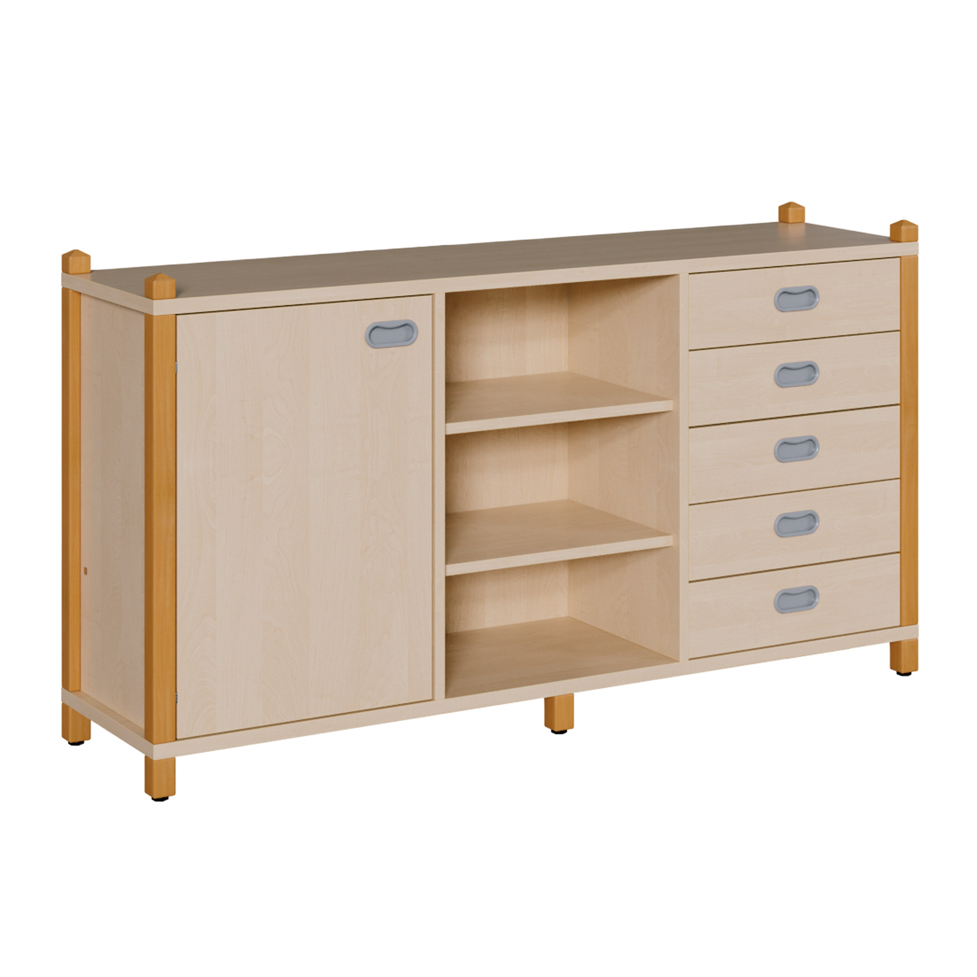 B/H/T: 156x80x40 cm, rechts 5 Schübe mit Dekorblende, links Tür, mittiges Regal, 4 Einlegeböden