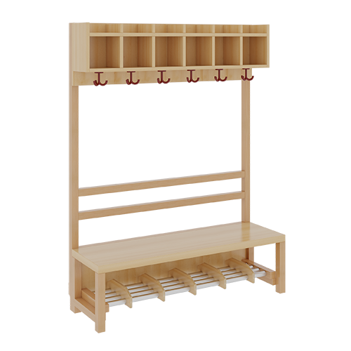 B/H/T: 120x158x39 cm, 6 Plätze, Sitzhöhe: 42 cm, offene Stütze in Buche-massiv, Schuhrost aus Aluminiumrohren mit Facheinteilungen