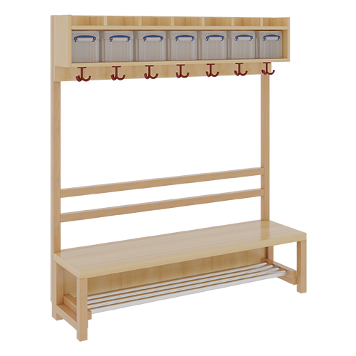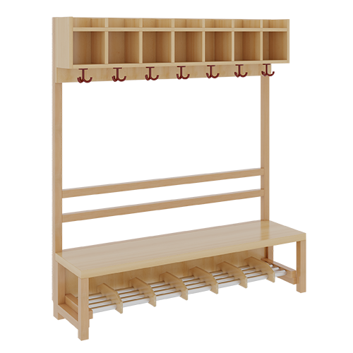 B/H/T: 140x158x39 cm, 7 Plätze, Sitzhöhe: 42 cm, offene Stütze in Buche-massiv, Schuhrost aus Aluminiumrohren mit Facheinteilungen