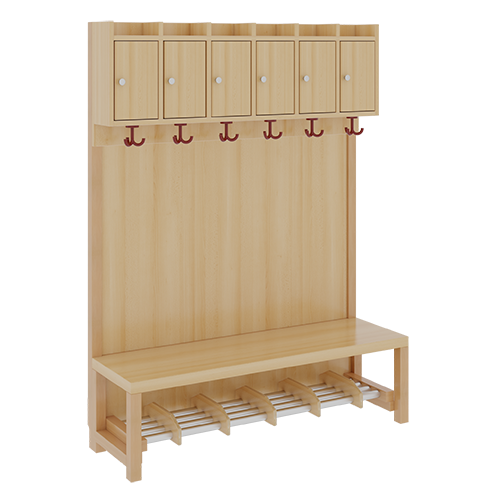 B/H/T: 120x158x39 cm, 6 Plätze, Sitzhöhe: 42 cm, Stütze mit Paneelrückwand, Schuhrost aus Aluminiumrohren mit Facheinteilungen
