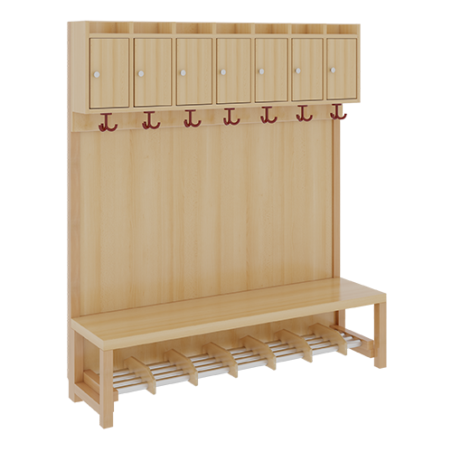 B/H/T: 140x130x39 cm, 7 Plätze, Sitzhöhe: 34 cm, Stütze mit Paneelrückwand, Schuhrost aus Aluminiumrohren mit Facheinteilungen