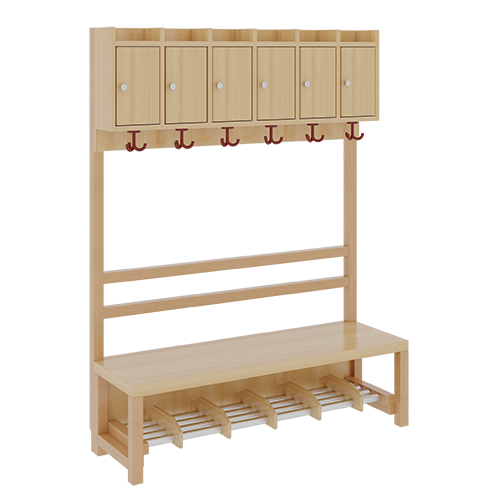 B/H/T: 120x158x39 cm, 6 Plätze, Sitzhöhe: 42 cm, offene Stütze in Buche-massiv, Schuhrost aus Aluminiumrohren mit Facheinteilungen