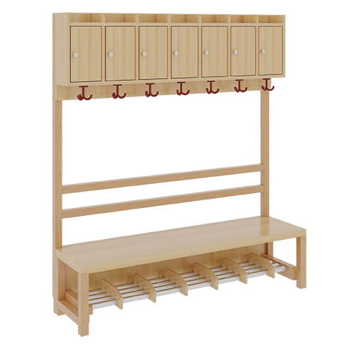 B/H/T: 140x158x39 cm, 7 Plätze, Sitzhöhe: 42 cm, offene Stütze in Buche-massiv, Schuhrost aus Aluminiumrohren mit Facheinteilungen