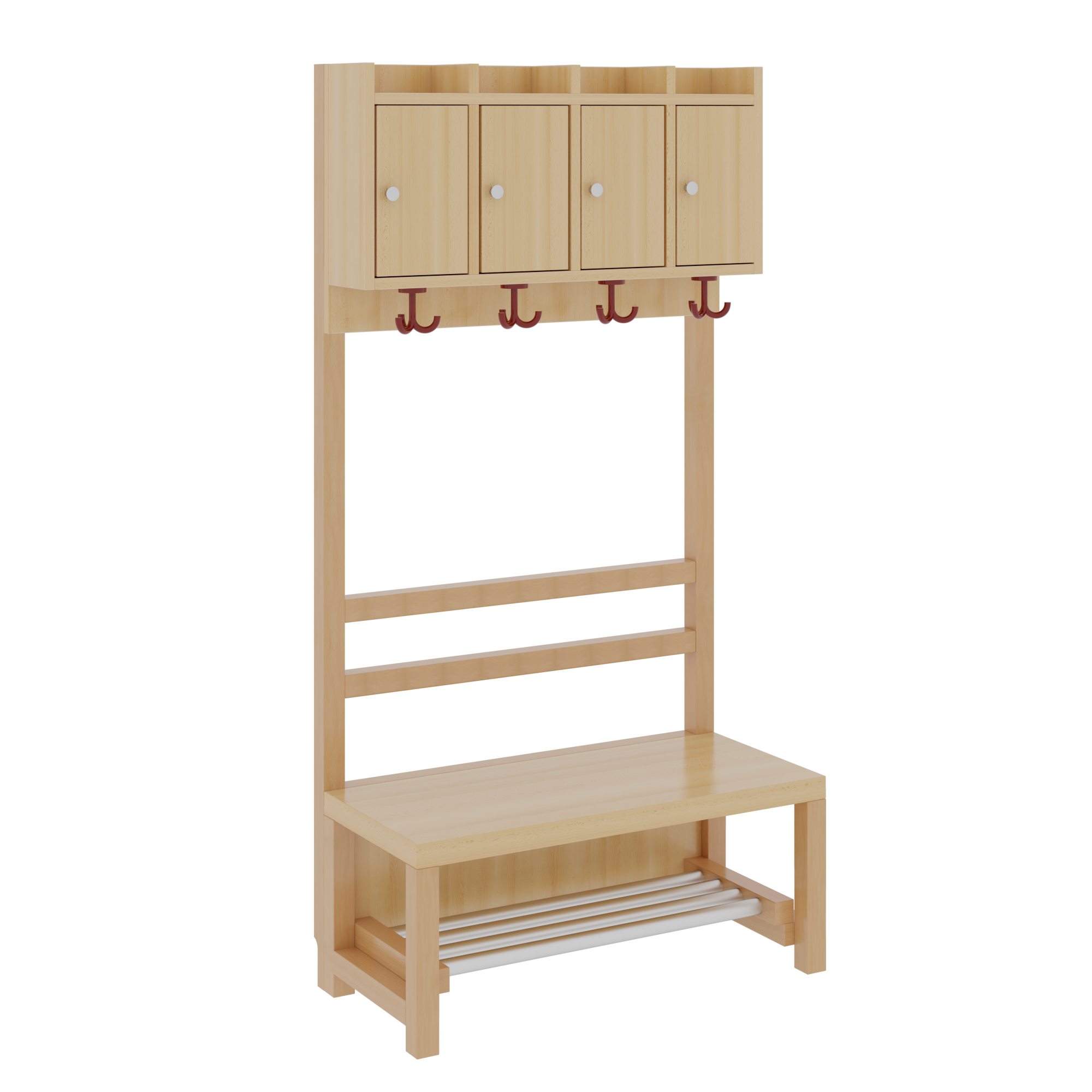 B/H/T: 100x158x39 cm, 5 Plätze, Sitzhöhe: 42 cm, offene Stütze in Buche-massiv, Schuhrost aus Aluminiumrohren mit Facheinteilungen