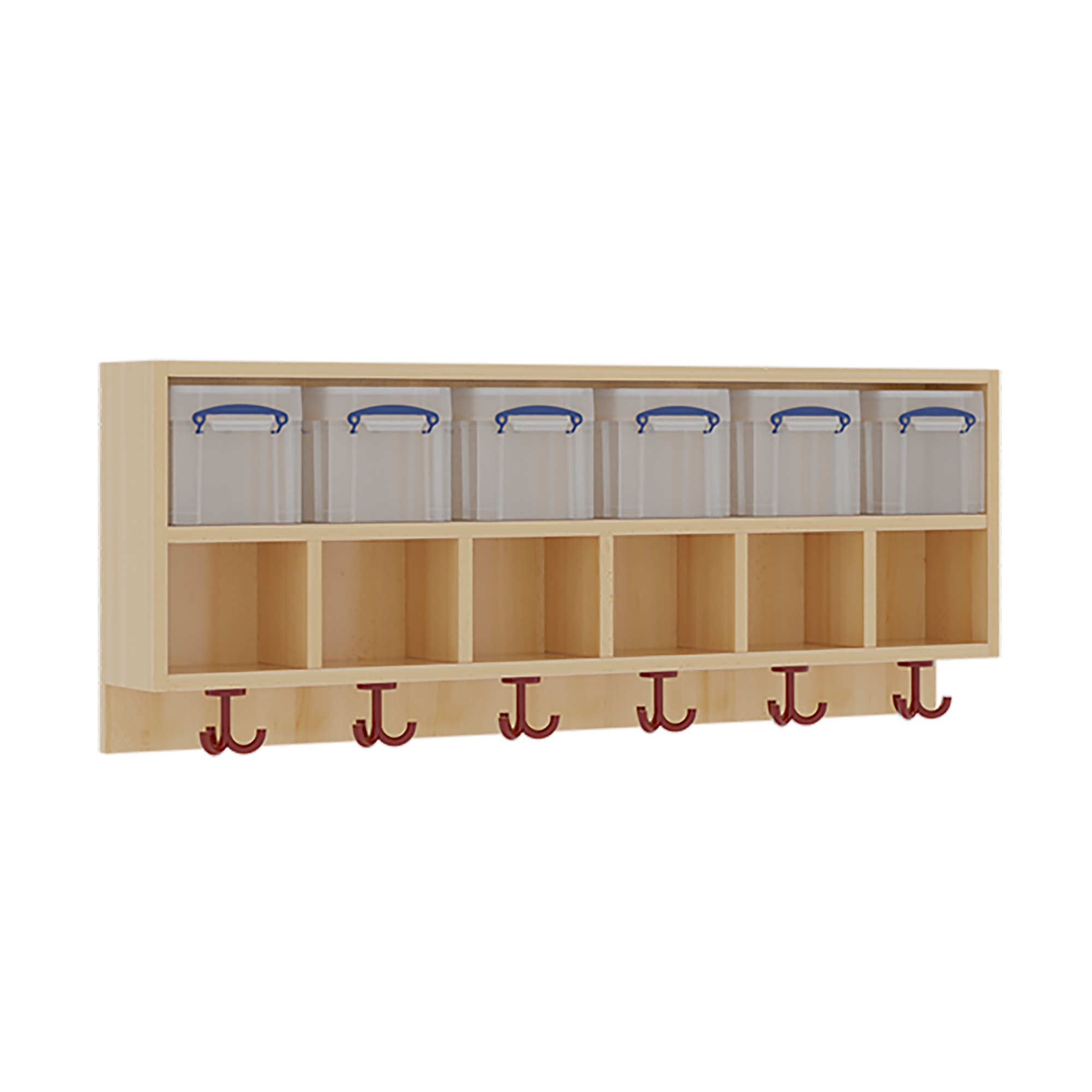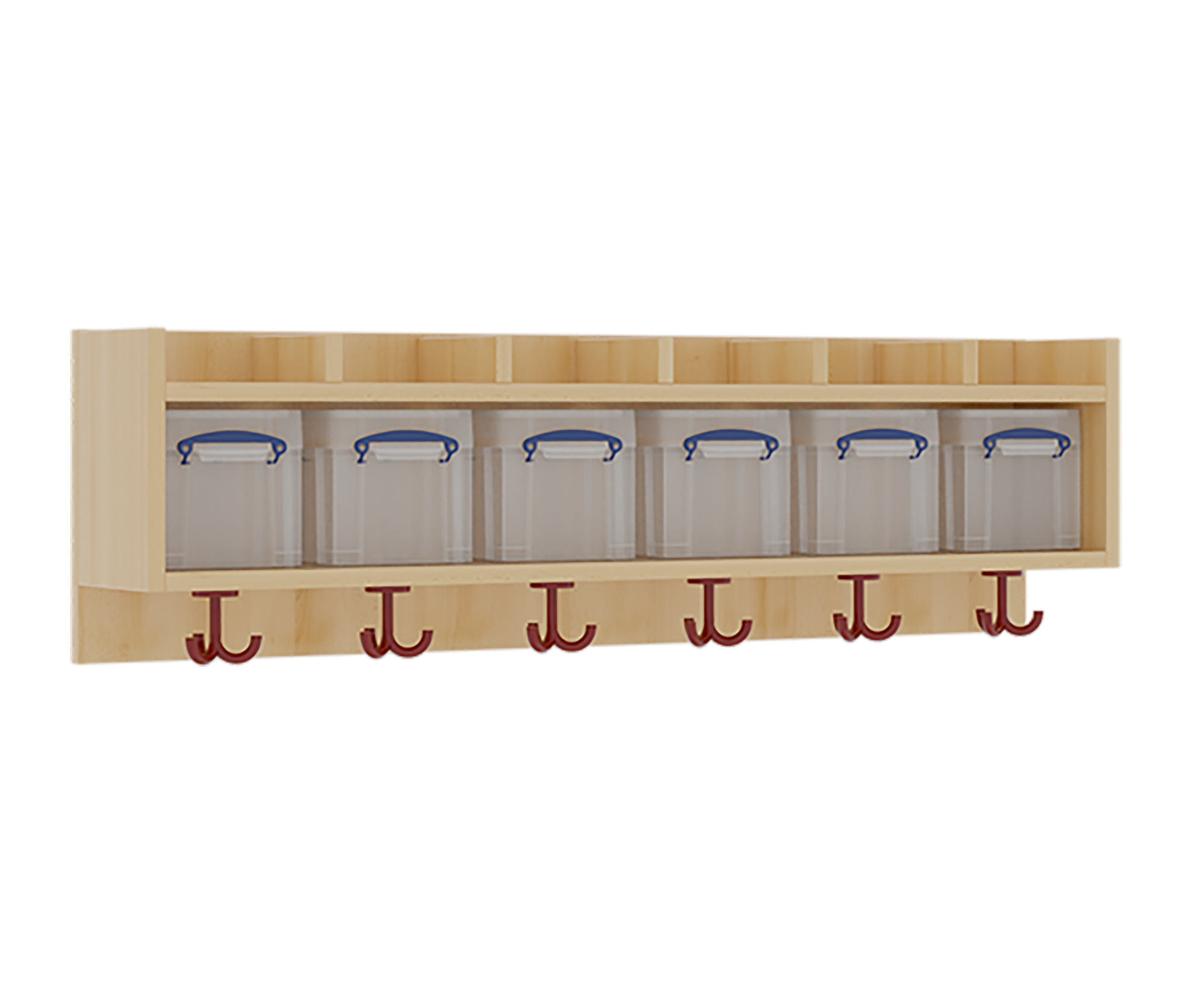 B/H/T: 120x34,5x27 cm, oben 6 flache, nach oben offene Ablagen, darunter 6 Kunststoffboxen mit Deckel, unten 3fach-Haken