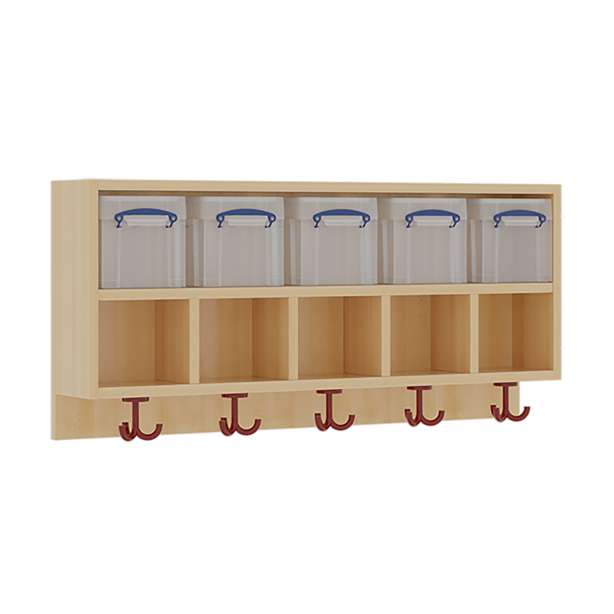 B/H/T: 100x34,5x27 cm, oben 5 flache, nach oben offene Ablagen, darunter 5 Kunststoffboxen mit Deckel, unten 3fach-Haken