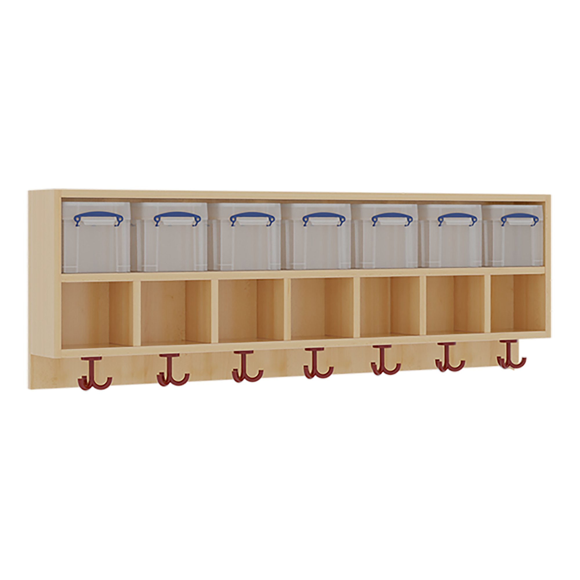B/H/T: 140x34,5x27 cm, oben 7 flache, nach oben offene Ablagen, darunter 7 Kunststoffboxen mit Deckel, unten 3fach-Haken