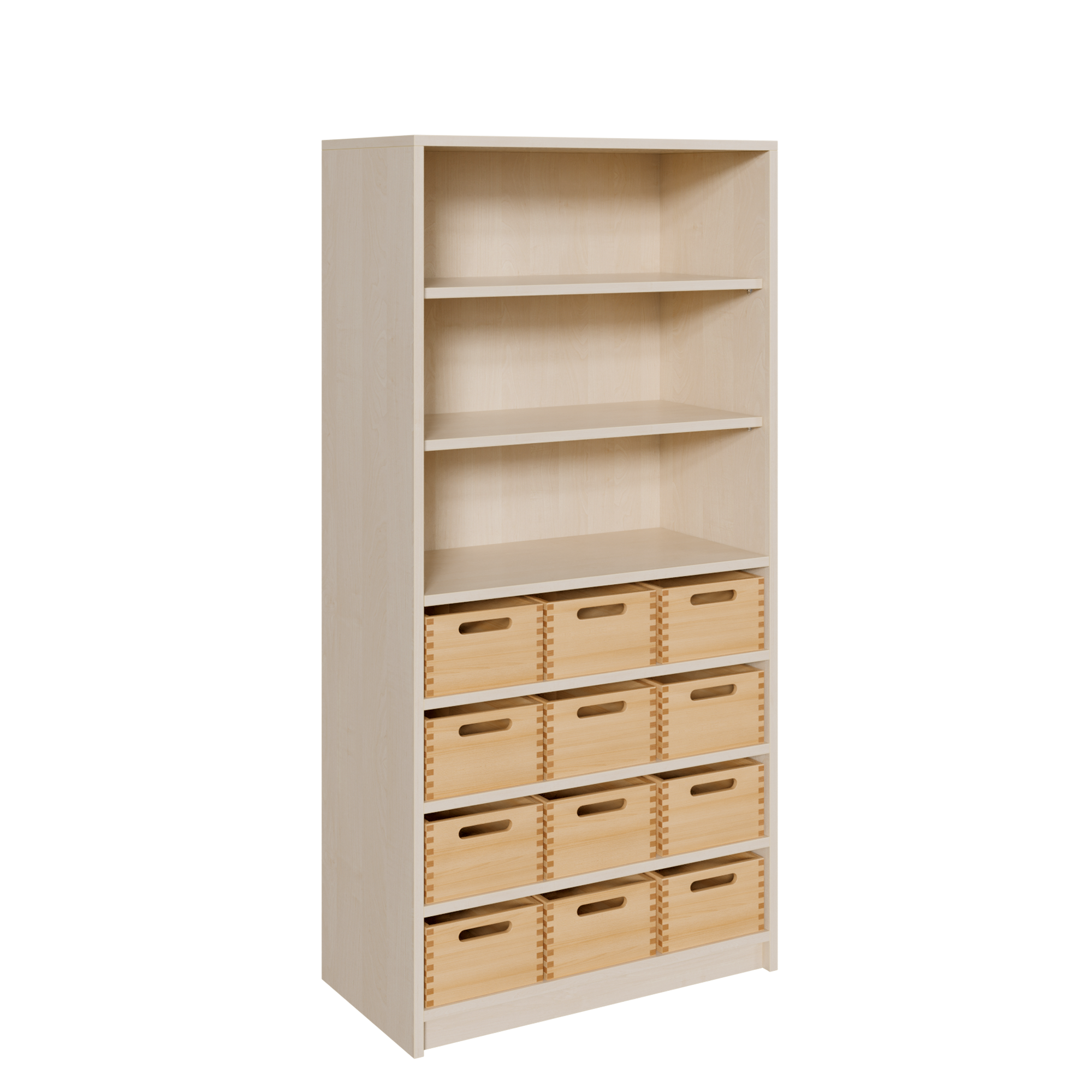 B/H/T: 78x160x40 cm, unten mit 12 Massivholz-Kästen (ohne Sichtfenster), oben Regal mit 3 Fächern