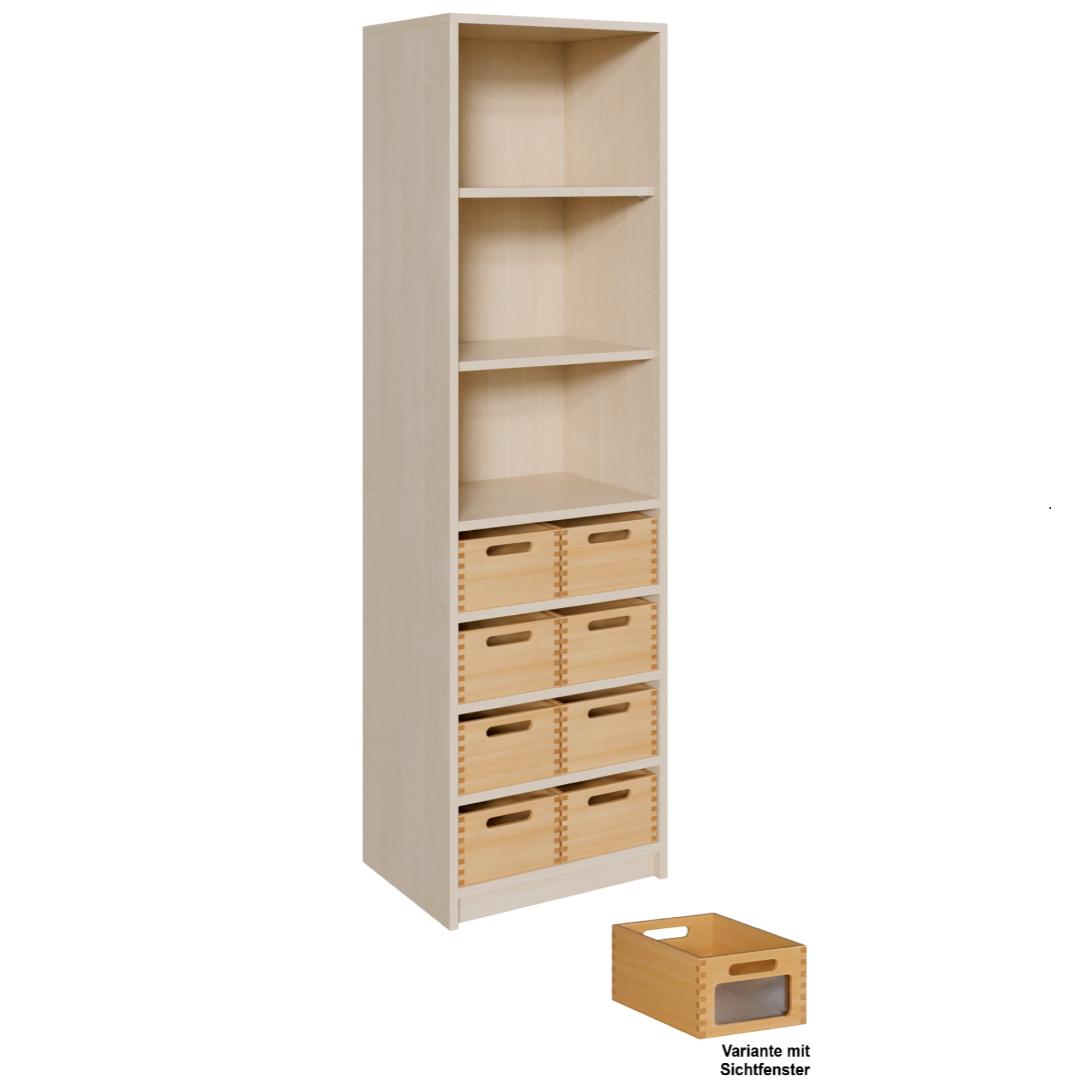 B/H/T: 52x180x40 cm, unten mit 8 Massivholz-Kästen (ohne Sichtfenster), oben Regal mit 3 Fächern