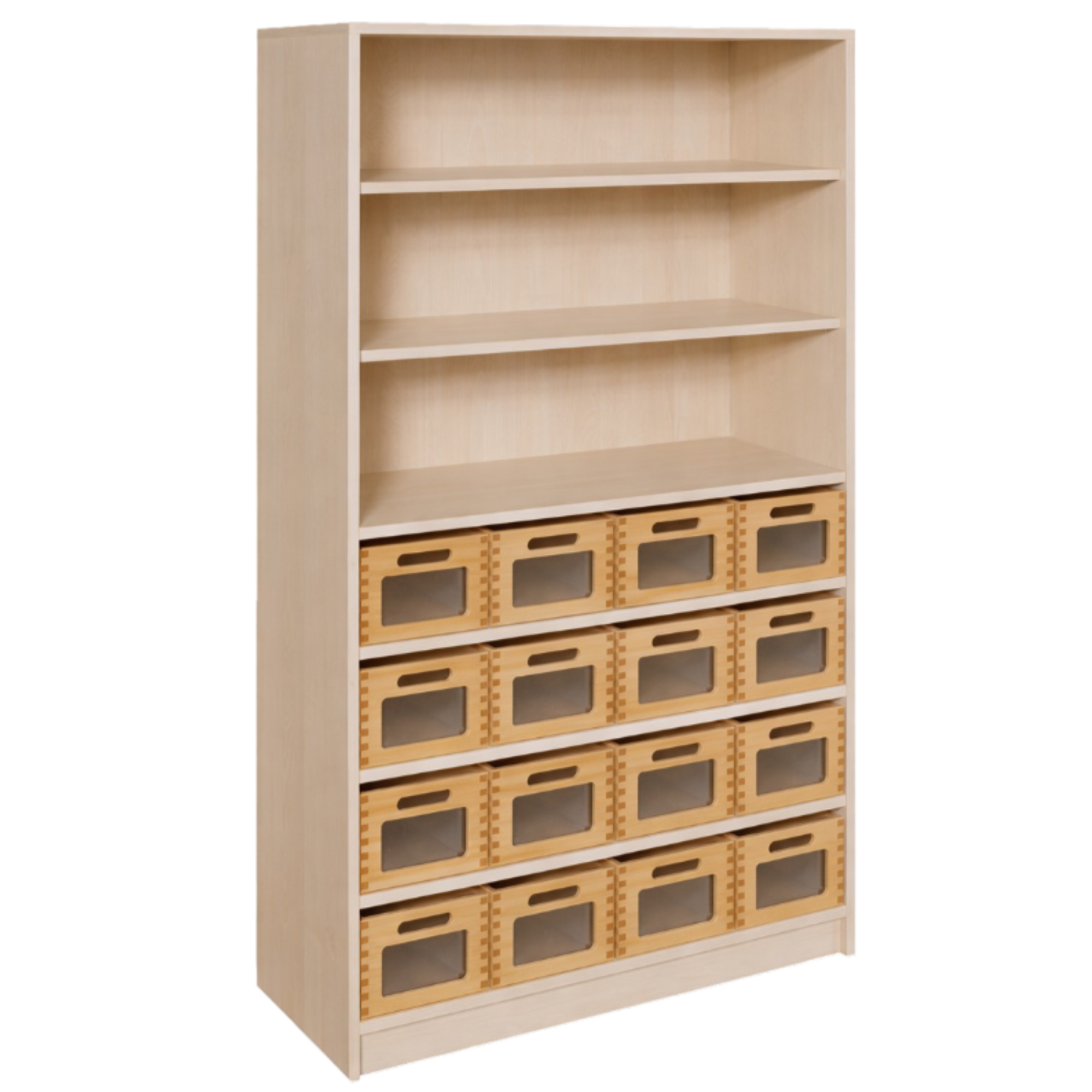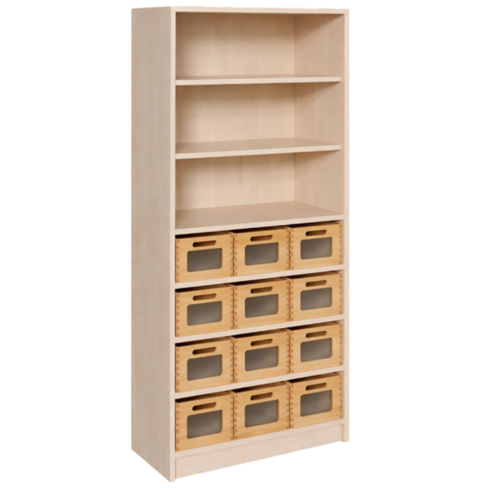 Korpus-Regal mit Materialkästen und offenen Fächern